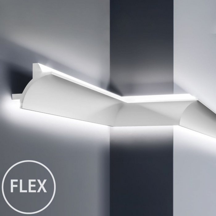 Deckenleiste indirektes Licht KF703 Flex kann zusammen mit Deckenleiste indirektes Licht KF703. Die flexible Leiste kann gebogen und gefaltet werden und eignet sich daher zur Verwendung als Deckenleiste an abgerundeten Wänden, und Stellen, an denen herkömmliche Deckenleisten nicht verwendet werden können. Die flexiblen Leisten bestehen aus Polyurethan (PU), einem stoß- und wasserfesten Material.