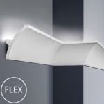 Deckenleiste indirektes Licht KF708 Flex kann zusammen mit Deckenleiste indirektes Licht KF708. Die flexible Leiste kann gebogen und gefaltet werden und eignet sich daher zur Verwendung als Deckenleiste an abgerundeten Wänden, und Stellen, an denen herkömmliche Deckenleisten nicht verwendet werden können. Die flexiblen Leisten bestehen aus Polyurethan (PU), einem stoß- und wasserfesten Material.