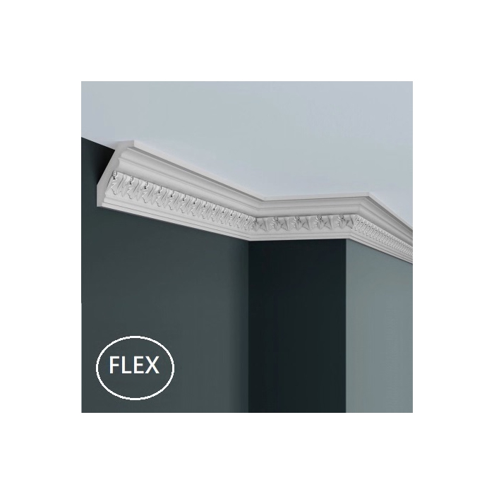 Deckenleiste Z162 Flex kann zusammen mit Deckenleiste Z162. Die flexible Leiste kann gebogen und gefaltet werden und eignet sich daher zur Verwendung als Deckenleiste an abgerundeten Wänden, und Stellen, an denen herkömmliche Deckenleisten nicht verwendet werden können. Die flexiblen Leisten bestehen aus Polyurethan (PU), einem stoß- und wasserfesten Material.