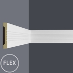 Wandleiste Z329 Flex kann zusammen mit Wandleiste Z329. Die flexible Leiste kann gebogen und gefaltet werden und eignet sich daher zur Verwendung als Wandleiste an abgerundeten Wänden, und Stellen, an denen herkömmliche Wandleisten nicht verwendet werden können. Die flexiblen Leisten bestehen aus Polyurethan (PU), einem stoß- und wasserfesten Material.