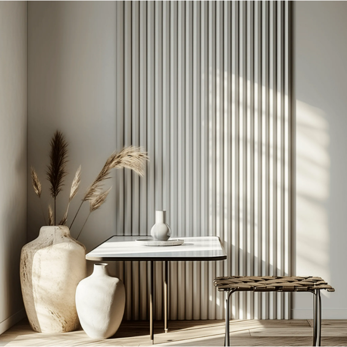 WP003L ist eine optische Ergänzung, um der linken Seite des WP003T einen harmonischen Abschluss zu verleihen. Genau wie die passende Lamellenwand, kann dieses Produkt in jeder Farbe auf Wasserbasis angestrichen werden.