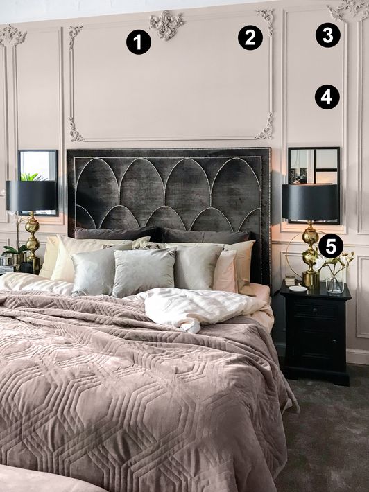 2. Buy or design yourself a large lovely headboard that either goes ton in tone with the wall or breaks completely. If it breaks, pick up this color on pillows, pots or details elsewhere.