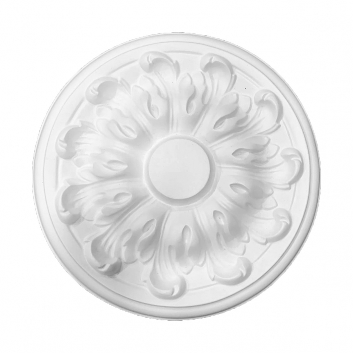 Ceiling rose R115 is made of polyurethane. All of our products are treated with a white primer and are ready to be painted. We recommend that you use water-based paints. The product is easy to mount with glue, and you can simply drill a hole and cut out space for a lamp hook and cover in order to hide the cables on the back side of the product.