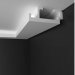 Cornice for indirect light is used to illuminate the ceiling. The back side of the cornice has a cavity with space for light sources. LED light sources are usually the best option as they are both easy to install and energy efficient. Indirect light is effective, decorative, and enhances the feeling of space. The scope of application is great; however, cornices for indirect light are usually placed a bit below the angle between ceiling and wall.