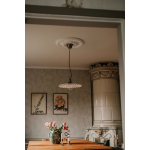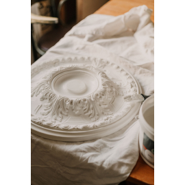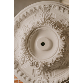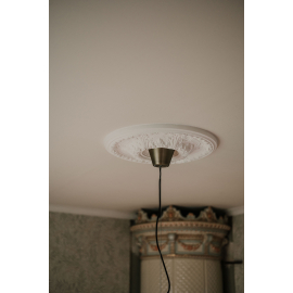 Ceiling rose K17 is made of styrofoam and easily mounted with glue. The material is easy to work with— a do-it-yourself installation! You can simply drill a hole and cut out space for a lamp hook and cover in order to hide the cables on the back side of the product. Use water-based paint.