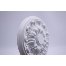 Ceiling rose R115 is made of polyurethane. All of our products are treated with a white primer and are ready to be painted. We recommend that you use water-based paints. The product is easy to mount with glue, and you can simply drill a hole and cut out space for a lamp hook and cover in order to hide the cables on the back side of the product.