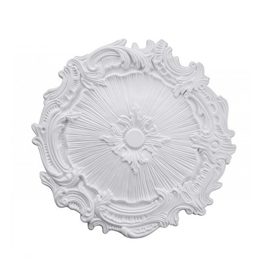 Ceiling rose R125 is made of polyurethane. All of our products are treated with a white primer and are ready to be painted. We recommend that you use water-based paints. The product is easy to mount with glue, and you can simply drill a hole and cut out space for a lamp hook and cover in order to hide the cables on the back side of the product.