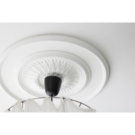 Ceiling rose R250 is made of polyurethane and easily mounted with glue. The material is easy to work with— a do-it-yourself installation! You can simply drill a hole and cut out space for a lamp hook and cover in order to hide the cables on the back side of the product.