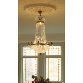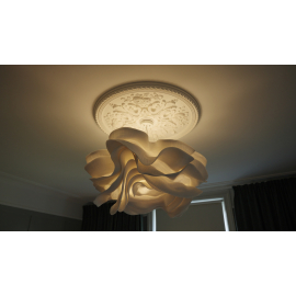 Ceiling rose Z16 is made of polyurethane. All of our products are treated with a white primer and are ready to be painted. We recommend that you use water-based paints. The product is easy to mount with glue, and you can simply drill a hole and cut out space for a lamp hook and cover in order to hide the cables on the back side of the product.