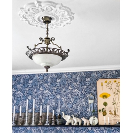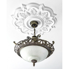 Ceiling rose Z26 is made of polyurethane. All of our products are treated with a white primer and are ready to be painted. We recommend that you use water-based paints. The product is easy to mount with glue, and you can simply drill a hole and cut out space for a lamp hook and cover in order to hide the cables on the back side of the product.