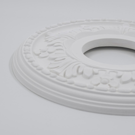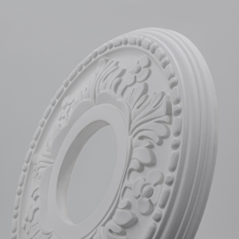 Ceiling rose Z44 is made of polyurethane. All of our products are treated with a white primer and are ready to be painted. We recommend that you use water-based paints. The product is easy to mount with glue, and you can simply drill a hole and cut out space for a lamp hook and cover in order to hide the cables on the back side of the product.