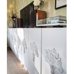 Originally, stuccos were made by carving out patterns in wood, but several hundred years later, industries developed stuccos in plaster instead. The contemporary material, Polyurethane, brought forth great creativity and potentials to recreate, repair, and redesign architectural buildings, historical heritage, aesthetic places and interiors: new as well as old. The decorations can be also painted so they may match well with the ceiling and/or wall. Additionally, the new method is cheaper, easier to fabricate and set up, and it is more environmentally friendly.