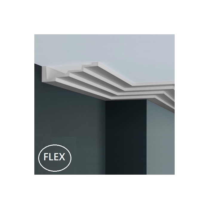 The flex moulding is made of polyurethane (PU), a shock- and water-resistant material, which makes the cornice suitable for bathrooms, spas, or any other humid areas.