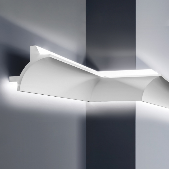 Cornice for indirect light is used to illuminate the ceiling. The back side of the cornice has a cavity with space for light sources. LED light sources are usually the best option as they are both easy to install and energy efficient. Indirect light is effective, decorative, and enhances the feeling of space. The scope of application is great; however, cornices for indirect light are usually placed a bit below the angle between ceiling and wall.