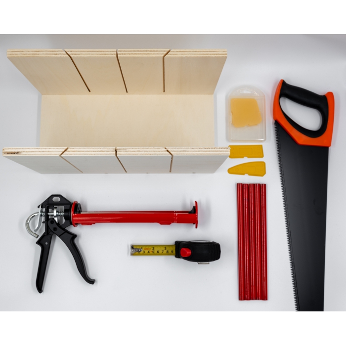 La boîte à onglets comprise dans le kit est pratique et convient à des moulures jusqu’à 15 cm de hauteur/profondeur.