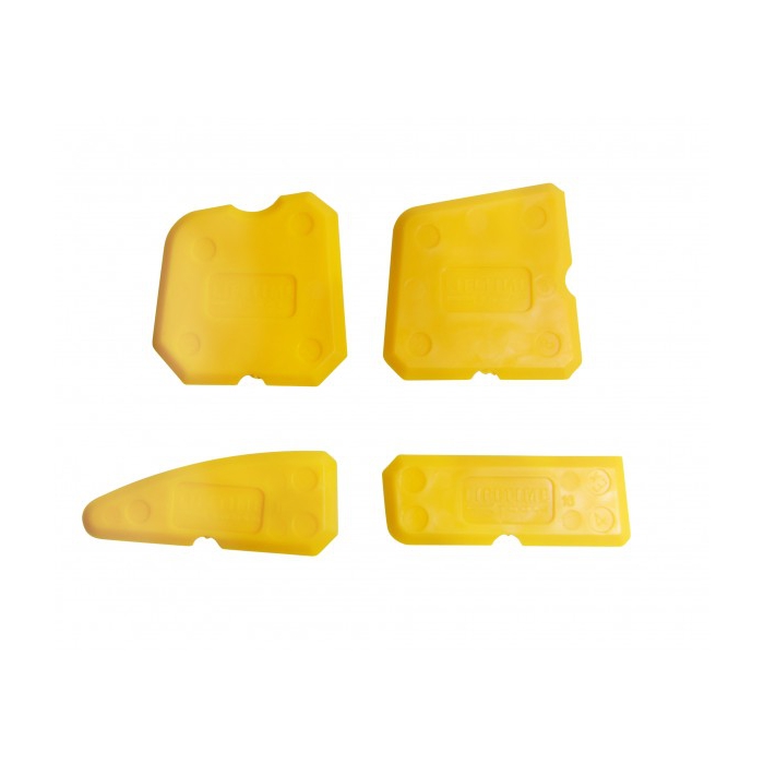 Set de mastic avec quatre grattoirs en silicone différents. Utilisez les grattoirs pour enlever l'excès de mastic et pour obtenir facilement des surfaces de joints parfaites.