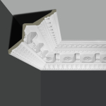 La corniche est fabriquée en polyuréthane, un matériau résistant aux chocs et à l'eau. Les profilés sont résistants aux chocs et ont une surface blanche, épaisse, lisse qui peut être peinte.