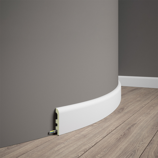 Le Plinthe MD355 Flexible est une moulure flexible qui peut être utilisée avec le Plinthe MD356. Le moulure flexible est souple et pliable et peut donc être utilisé comme une plinthe contre des murs arrondis ou lorsqu'une plinthe ordinaire ne peut pas être utilisée. Le moulure flexible est fabriqué en polyuréthane (PU), un matériau résistant aux chocs et à l'eau.