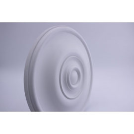 Ceiling rose R128 is made of polyurethane. All of our products are treated with a white primer and are ready to be painted. We recommend that you use water-based paints. The product is easy to mount with glue, and you can simply drill a hole and cut out space for a lamp hook and cover in order to hide the cables on the back side of the product.