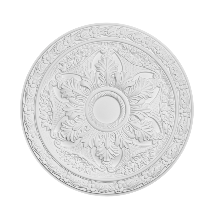 Ceiling rose T082 is made of polyurethane. All of our products are treated with a white primer and are ready to be painted. We recommend that you use water-based paints. The product is easy to mount with glue, and you can simply drill a hole and cut out space for a lamp hook and cover in order to hide the cables on the back side of the product.