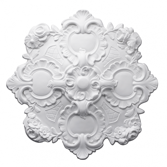 Ceiling rose Z56 is made of polyurethane. All of our products are treated with a white primer and are ready to be painted. We recommend that you use water-based paints. The product is easy to mount with glue, and you can simply drill a hole and cut out space for a lamp hook and cover in order to hide the cables on the back side of the product.