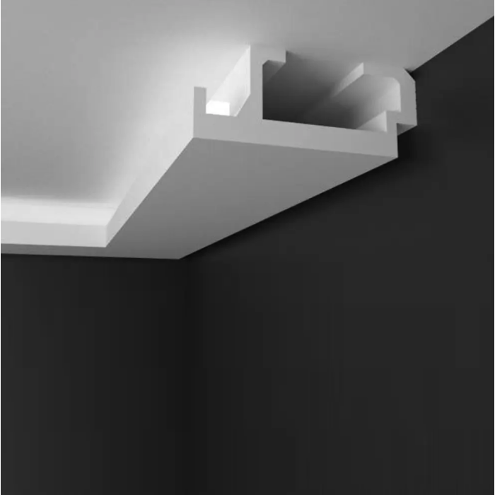 Cornice for indirect light is used to illuminate the ceiling. The back side of the cornice has a cavity with space for light sources. LED light sources are usually the best option as they are both easy to install and energy efficient. Indirect light is effective, decorative, and enhances the feeling of space. The scope of application is great; however, cornices for indirect light are usually placed a bit below the angle between ceiling and wall.